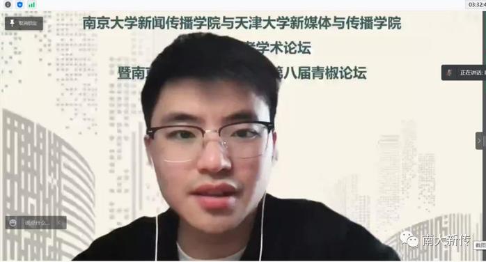 副院长胡翼青教授发表致辞。他对各位老师不辞辛苦坚持参会的行动表示了感谢,对连续举办了八届的青椒论坛的深厚传统表示了肯定,并认为此次论坛对南大和天大都具有里程碑式的意义。通过对自己亲身经历的分享,胡翼青教授强调了青年学者间交流与对话的重要性。他希望这次论坛体现出两点风采,第一是任何学者之间都能平等对话,第二是评议人点评不留情面,以帮助青年教师更快成长,希望各位青椒能在丰富的日程安排和激烈的对谈交锋中享受学术的快乐。