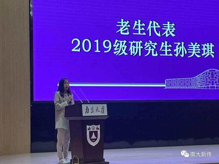 21级学硕陈丽敏作为新生代表进行了发言。相比于一些同学来说,她是一名老生,因为她已经在这里度过了本科时光,但她更是一名新生,对研究生的学习生活既紧张、又期待。她说,南大新传容得下真相和真理,更容得下情怀与理想,期待未来能与大家携手并进,探索无边无际的学术海洋、捍卫新闻传播的事业与价值,在更大的舞台上发出我们的声音。