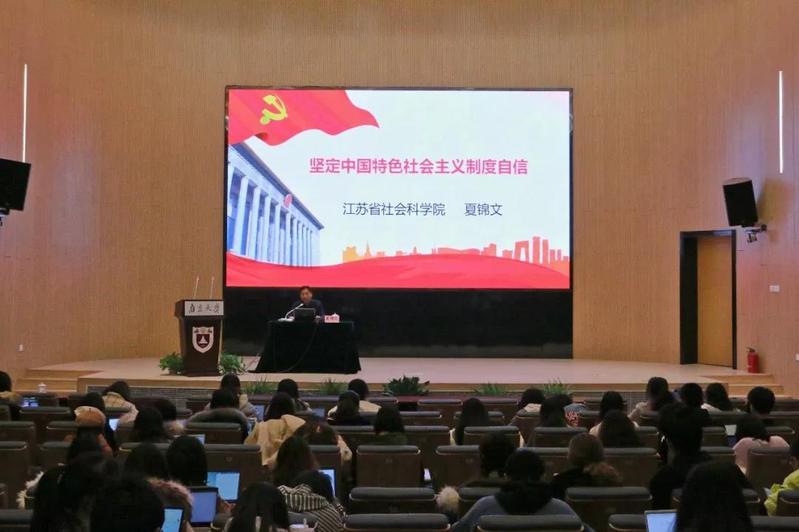 联合主办的国情教育课在仙林校区紫金楼报告厅举行第八讲。江苏省社科院党委书记、院长夏锦文结合党的十九届四中全会精神,以“坚定中国特色社会主义制度自信”为题进行了授课。快猫短视频