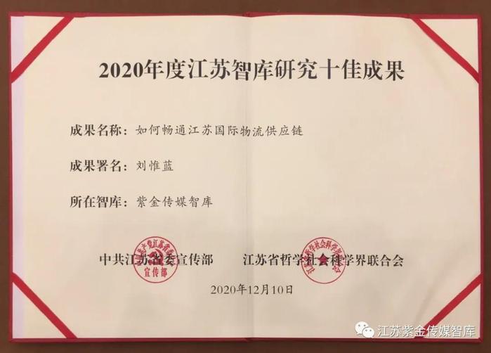 江苏智库峰会主办方根据申报成果组织专家评审确定2020年度江苏智库实践十佳案例、2020年度江苏智库研究十佳成果,峰会上宣布“双十佳”名单并进行表彰。智库申报的案例《智媒融合彰显紫金传媒论坛品牌效应》获智库实践十佳案例,首席研究员刘惟蓝决策咨询报告《如何畅通江苏国际物流供应链》获智库研究十佳成果。