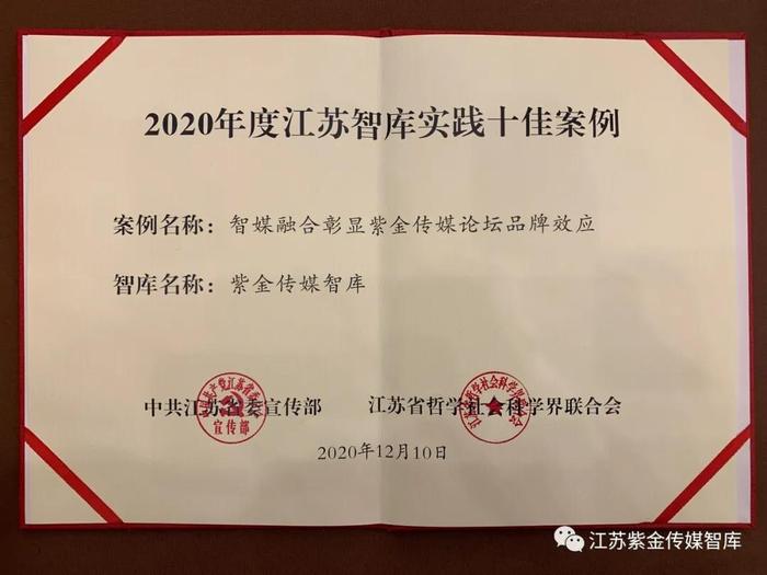 今天,由省委宣传部和省社科联共同主办的第五届江苏智库峰会在南京举行,大会公布了2020年度江苏智库实践十佳案例、2020年度江苏智库研究十佳成果,紫金传媒智库在实践案例和研究成果两方面均入选“十佳”。