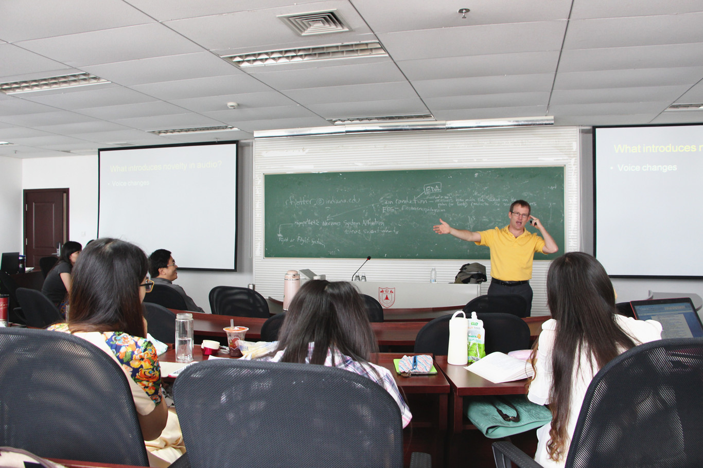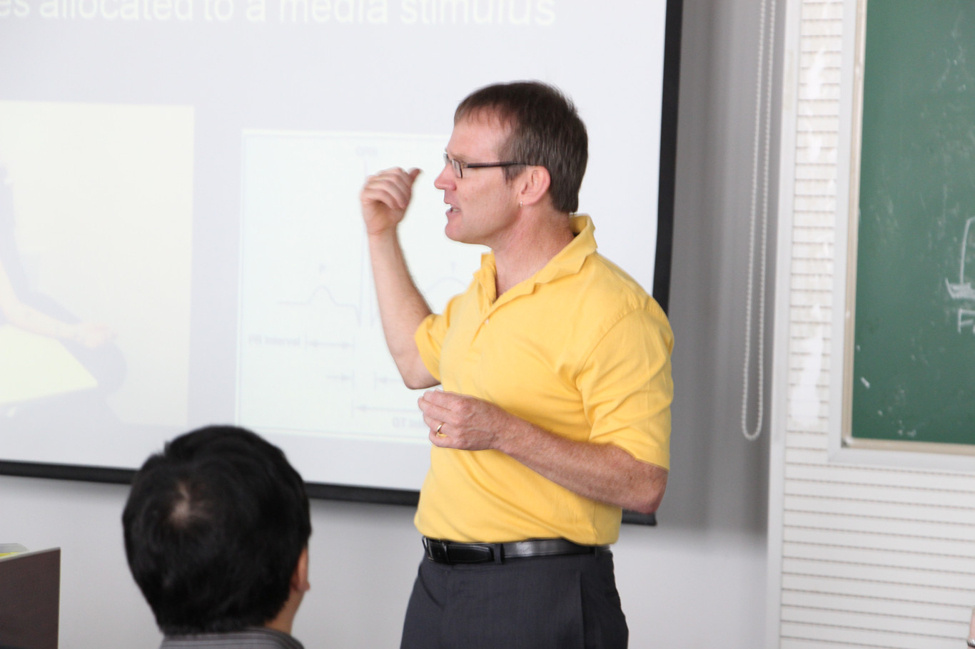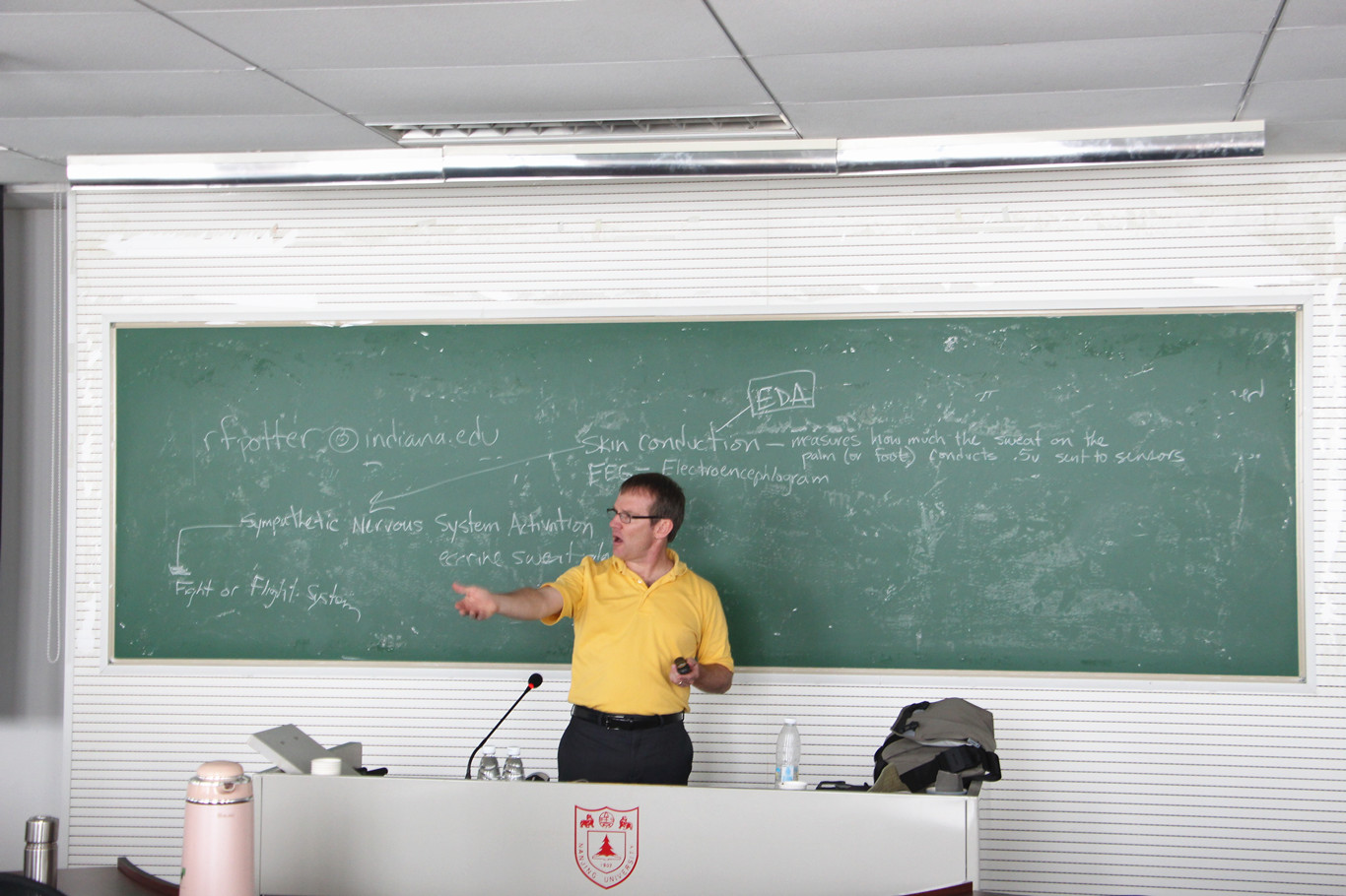 Potter教授从心理生理学的基础假设谈起,指出“大脑是涉身性的(embodied)”,这一认知不承认笛卡尔式的心灵-肉体难题,认为大脑和其他身体系统都是真实存在并相互连接的。认知过程可以从身体反应推倒出来。而身体的首要功能是“保持活力”,包括大脑在内的身体的大部分功能都与维持生命这一任务相联系,而并非只服务于思考,适用心理生理学测量时,必须牢记这一点,以寻找到真正的心理生理信号。大脑和身体的运转会随着事件而变化,由此Potter教授强调了心理生理学对时间过程中的心理生理变化和测量的重视。通过一系列基本理念的介绍,帮助大家理解了心理生理学的理论逻辑和实践操作。Potter教授还讲述了脑电图、皮肤电传导、面部肌电图、心搏、功能性磁共振成像等测量方法的优缺点和研究案例。