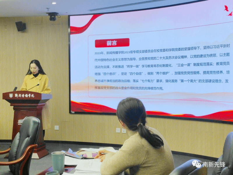 2023级学硕党支部书记黄麒霖和2023级专硕党支部书记黄炜淇分别就2023年下半年的支部工作进行了汇报。2023级专硕党支部书记黄炜淇着重汇报了支部成立三个月来完善制度建设、开展专题学习与组织生活的具体情况,介绍了支部开展的红色主题剧本杀等创新性活动,明确表示未来将利用好学校红色教育资源,加强理论学习与实践锻炼。联系支部的党委委员李晓愚认为支部活动呈现出“实”和“新”两大特色,活动参与感强,期待未来能在实践应用方面进行更多尝试。