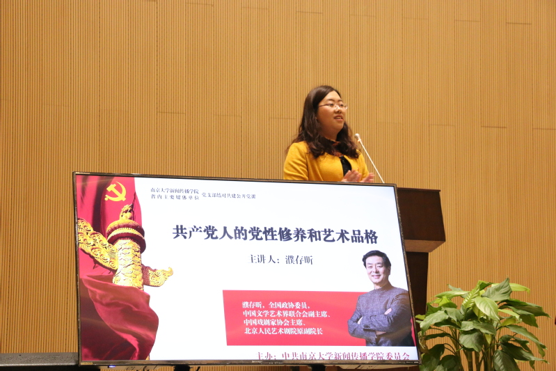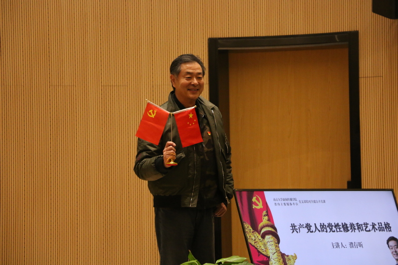 为了更直观地展现话剧表演的工作形式,濮先生还为大家播放了一则短片,带领现场师生一探北京人艺的后台。短片中,无论是就一句台词精心打磨,还是对一个动作反复推敲,均能反映出濮存昕及整个团队对艺术的敬畏与求索。曾任北京人民艺术剧院的副院长,濮存昕坦言肩上的担子很重,自己不仅需要是一名好演员,还得思考如何为青年演员提供戏剧教育,并将人艺的“金字招牌”传承下去。在短片末尾,镜头中的濮存昕默然注视着人艺新建的剧场,“盖房子很快,培养一个人很慢”。这份对于文艺事业沉甸甸的担当,令在场党员无不动容。