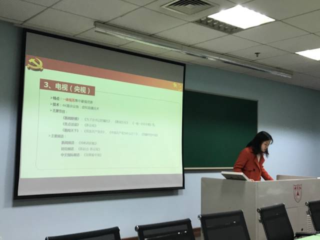 第一个环节是以“不同媒体解读十九大”为主题,党员们从自身专业出发,对不同媒体的十九大报道进行了梳理和分析,从而更加全面地认识十九大。刘晓艺同学认为,在今年的十九大报道中,各媒体纷纷“创新报道”,通过异彩纷呈的全媒体、融媒体产品,实现了传播价值的最大化。此次十九大开幕之际,来自人民日报中央厨房青创工厂的《燃爆!人民日报首部闪卡H5动画“史上最牛团队创业经”》秒刷手机屏,产品用最闪爆的方式打开人民日报十九大报道的大幕。此外,许多外媒也对十九大点赞。英国《卫报》刊文指出,在篇幅很长的十九大报告中,习近平展现出来的自信和中国的雄心令人瞩目。经过过去五年的发展,各项喜人数据以及国际地位的变化表明,中国已经进入一个新时代。俄罗斯《独立报》刊文指出,中国在过去五年里,通过提出“一带一路”倡议和人类命运共同体理念,在全球治理中发挥了重要作用。中国共产党领导国家所取得的显著成就,无疑让世界更加瞩目中国。