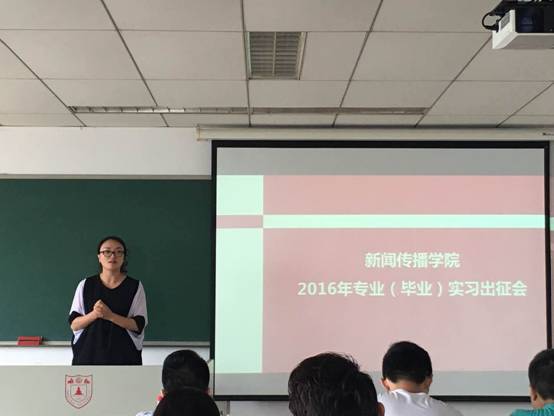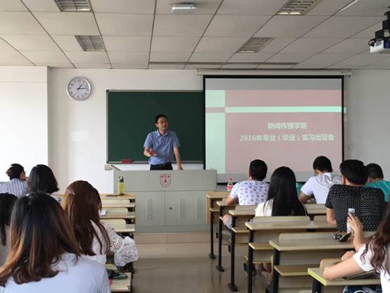 2016年专业实习出征会在逸B507教室举行,会议由辅导员徐志萍主持,党委副书记范赟和教学副院长胡翼青出席并就快猫短视频