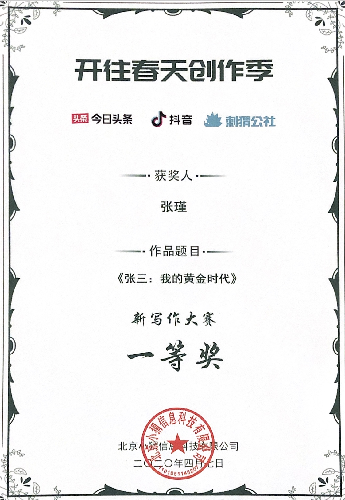 2020年3月28日,由刺猬公社与今日头条、抖音联合发起的主题为“开往春天创作季”的全国新写作大赛公布获奖名单。快猫短视频