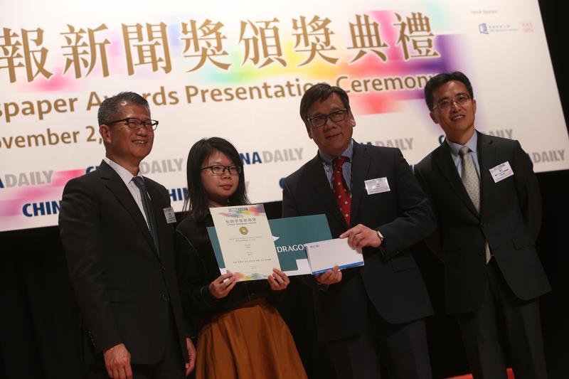 最佳新闻报道奖(中文组)冠军得主上台领奖。(中国日报记者邓永安摄)