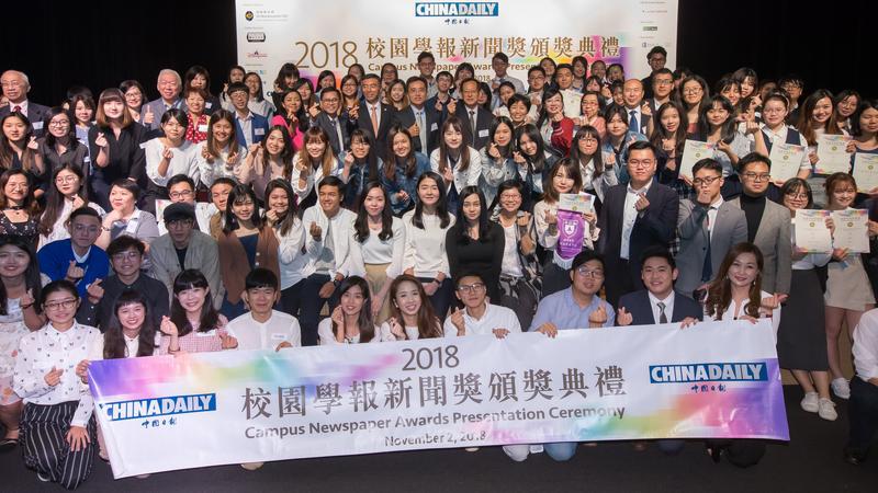 2018 年度校园新闻学报奖得主和嘉宾在香港浸会大学合影留念。(中国日报记者 廖雁雄摄)